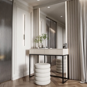 Konsolė gali būti naudojama tiek kaip kosmetinis staliukas, tiek kaip kompaktiškas darbo stalas namuose.
